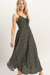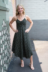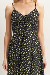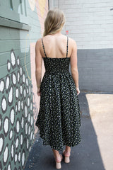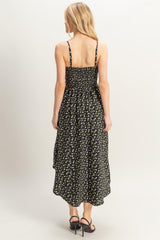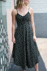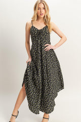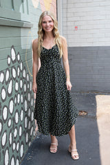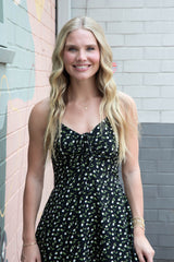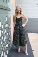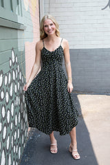 Twirl into summer with our Halle Midi Dress! This black beauty features a charming ditsy floral print and flattering sweetheart neckline. The smocked back and elastic waist ensure a perfect fit, while adjustable spaghetti straps let you customize your comfort. Complete with a flirty tie front and rounded hem, this sleeveless wonder is ready for picnics, brunches, or wherever your sunny adventures take you!