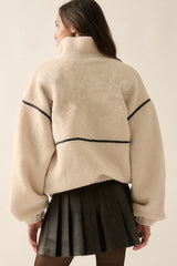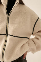 Cozy meets cool in the Hannah Sherpa Jacket in Cream! With soft sherpa lining and playful long balloon sleeves, this jacket wraps you in warmth and style. The chic mock neck and faux leather trim add a trendy edge, while side pockets and a zip-up closure keep things practical and snug. Perfect for crisp days when you want to feel comfy without sacrificing flair!