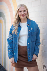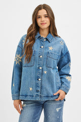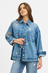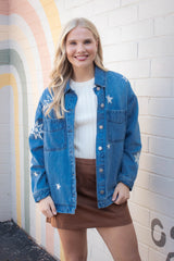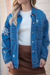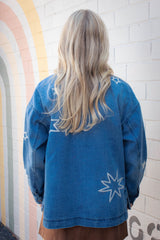 Add a dash of fun to your wardrobe with the Harlow Star Embroidered Denim Jacket. This medium-sized, oversized jacket features playful star embroidery and side slits for extra movement. The classic collar and button-down front make it easy to style, whether you’re layering up or wearing it solo. Perfect for those who love a relaxed fit with a little star power!