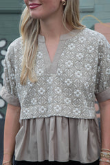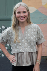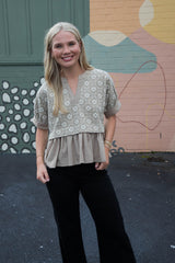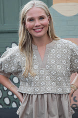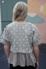 Add a playful twist to your wardrobe with the Harriet Mix Media Peplum Top in Mocha. Featuring a charming ruffled hem and puff short sleeves, this top brings fun volume and movement. The split V-neck adds a flirty touch, while the peplum style adds a bit of flair. Its unique mixed media pattern makes it a standout piece for any casual outing or lively gathering!