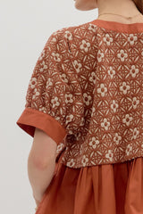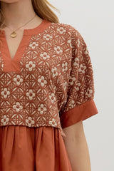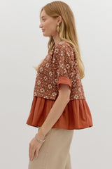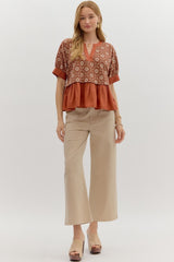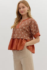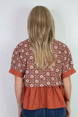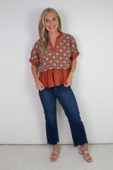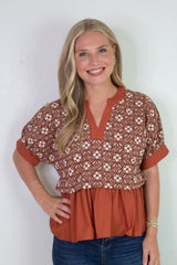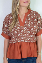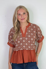 Add a playful twist to your wardrobe with the Harriet Mix Media Peplum Top in Rust. Featuring a charming ruffled hem and puff short sleeves, this top brings fun volume and movement. The split V-neck adds a flirty touch, while the peplum style adds a bit of flair. Its unique mixed media pattern makes it a standout piece for any casual outing or lively gathering!
