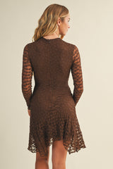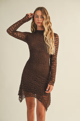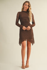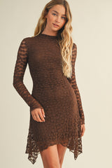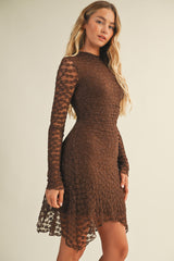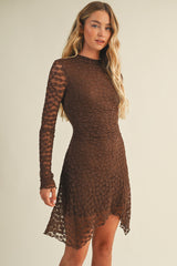 Embrace effortless charm in the Haven Floral Mesh Dress. This brown mini features playful gathered sides and a flirty asymmetrical hem that moves with you. Lightweight mesh fabric keeps things breezy, while long sleeves and a high neck add a touch of elegant mystery. Finished with a sleek back zipper, it’s perfect for dancing the night away or turning heads at your next event!