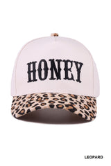 This playful Honey Two-Tone Canvas Cotton Cap features a cream crown with a bold leopard-print brim and striking black embroidered lettering. Designed with an adjustable strap, it offers a comfortable one-size-fits-most fit, perfect for adding a fun, wild touch to any outfit!