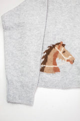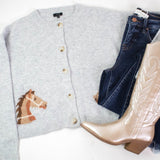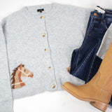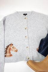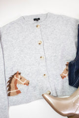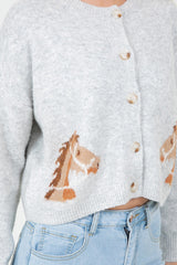 Add a dash of whimsy to your wardrobe with this grey cardigan featuring charming horse graphics. The button-up front and round neck make it easy to wear, while the long sleeves keep you cozy and stylish. Perfect for those who love a playful twist on classic comfort!