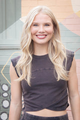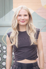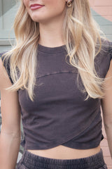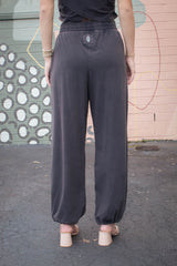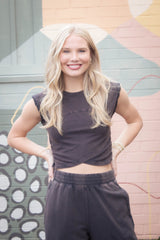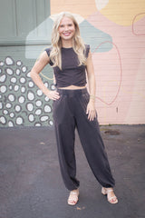 This playful Hot Shot Crossover Set in black features a round neck top with ruched sides, a draped hem, and adorable cuffed sleeves. The matching wide-leg pants offer an elastic waist for comfort, handy side pockets, and cinched ankles for a trendy finish. Softly washed for a lived-in feel, this set strikes the perfect balance of cozy and chic!