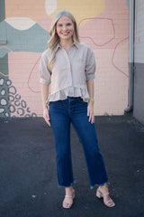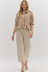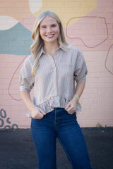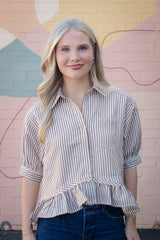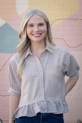 Get ready to add a pop of pizazz to your wardrobe with our Indie Striped Ruffle Hem Button Up Top in brown! This trendy top features flattering half sleeves, a charming ruffled hem, and a classic collared neckline. Plus, with a convenient chest pocket, you'll be ready for any adventure!