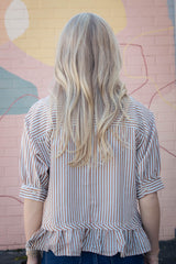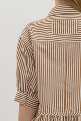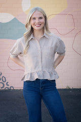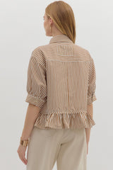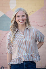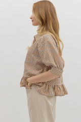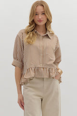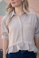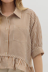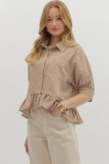 Indie Striped Ruffle Hem Button Up Top, Brown