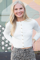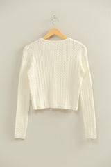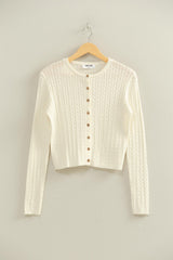 This playful cable knit cropped cardigan in whip cream is your new go-to for layering fun. Featuring a button-down front, round neck, and long sleeves, it adds a cozy yet stylish touch to any outfit. Perfect for those days when you want a little extra warmth with a lot of charm!