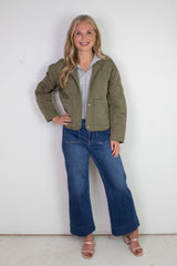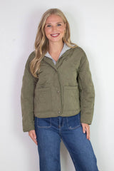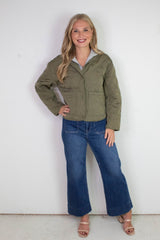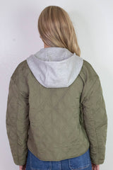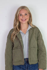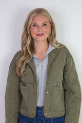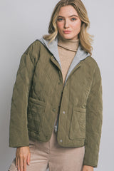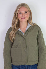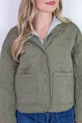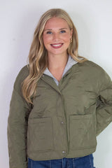 Stay cozy and stylish with the Iris Quilted Contrast Hood Jacket in Olive. Featuring a playful boxy fit and button-front design, it’s perfect for layering. The contrasting hood adds a fun twist, while front pockets keep your hands warm or your essentials close. Embrace comfort with a jacket that’s as charming as it is practical!