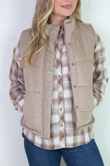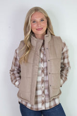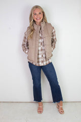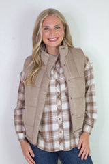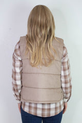 Stay cozy and stylish with the Isabelle Suede Puffer Vest in warm mocha. Its soft suede texture and playful funnel neck keep you snug, while the button and zipper closure add versatile flair. The puffer design provides lightweight warmth, and handy side pockets offer the perfect spot for your essentials or cold hands!