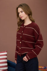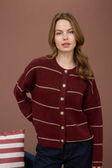Add a pop of playful charm to your wardrobe with the Jade Thin Stripe Button Down Cardigan in Red Wood. Featuring a cozy round neck, classic button-down front, and long sleeves, it effortlessly pairs comfort with style. The thin beige stripes bring a subtle, fresh twist to your everyday look—perfect for layering or wearing on its own for an easygoing, spirited vibe!