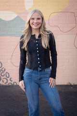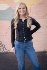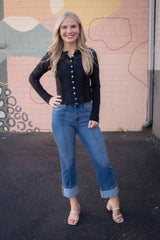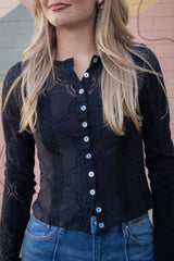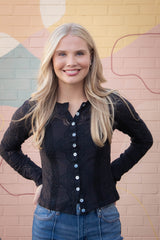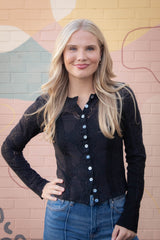 The Jae Knit Top in black combines playful charm with delicate detailing. Featuring a round neck and button-down front, it adds a flirty twist with lace and mesh accents. Semi-sheer fabric and rib-knit long sleeves create light, textured layers perfect for showing off your style with a bit of edge!