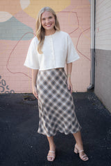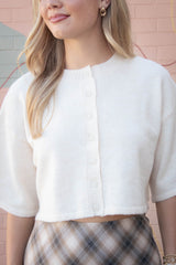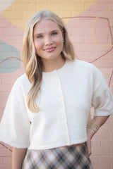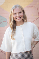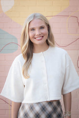 The Jeanne Cropped Crew Neck Sweater in Cream is your new go-to for effortless cool. With a playful cropped cut, classic crew neckline, and breezy short sleeves, it’s perfect for layering or rocking solo. The button front adds a fun twist, making it easy to style your look any way you want. Stay comfy, casual, and cute all day long!