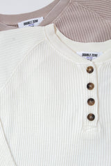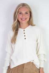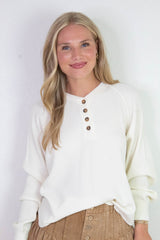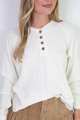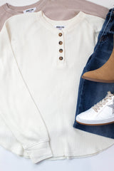 Stay cozy and stylish in the Jordan Knit Henley Top, featuring a playful waffle knit texture and a classic button closure. Its long sleeves and round neck make it perfect for layering or wearing solo, while the round hem adds a fun twist to your everyday look. In cream, this top brings warmth and charm to any outfit!