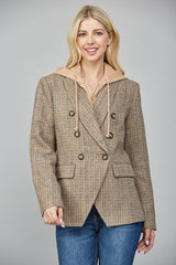 Meet the Jovie Hooded Blazer in a charming tan combo, where classic meets quirky! Featuring a striking herringbone pattern and double-breasted button closure, it keeps things sharp yet fun. The detachable drawstring hood inner layer adds a playful twist, perfect for changing up your vibe. With padded shoulders for a bold silhouette and handy front pockets, this collared blazer is ready to brighten up any day with style and ease!