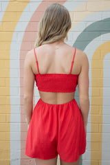Twirl into summer fun with our Julie Romper in vibrant red! This playful piece features delightful 3D flower details and a flirty cutout back with smocked design. The comfortable elastic waist and adjustable spaghetti straps ensure a perfect fit for all your warm-weather adventures!