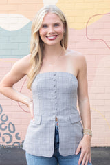 This playful plaid strapless top features charming button details and a flirty split hem for added style. Designed in a light taupe multi pattern, it fastens securely with a back zipper and hook closure. The front faux pockets add a fun, casual touch without compromising the sleek silhouette. Perfect for adding a trendy twist to any outfit!