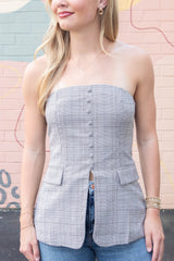 Juniper Plaid Strapless Button Detail Top, Light Taupe Multi