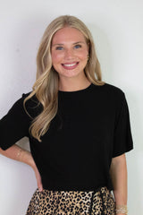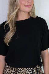 Elevate your casual look with the Karen Cropped Tee in Black. Featuring a playful boxy fit, short sleeves, and a comfy round neck, this ribbed knit top adds a fun twist to your everyday style. Perfect for layering or pairing with your favorite high-waisted pieces, it’s your new go-to for effortless charm and comfort!