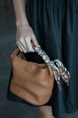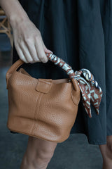 Introducing the Kehlani Mini Bucket Bag in brown. Equipped with a magnetic button closure, a stylish scarf detail on the handle, and a convenient coin purse (with included strap), this leather bag is perfect for on-the-go fashionistas. It's the perfect blend of function and style.