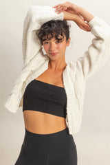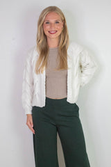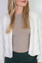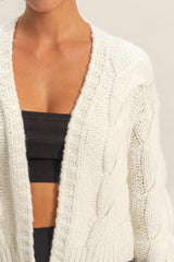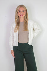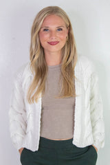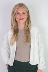 Cozy up in the Kennedy Cable Knit Cardigan in Whip Cream! With its playful cropped length and open front, this long-sleeve knit adds the perfect touch of charm to any outfit. Its soft cable knit texture keeps you warm while staying light and breezy—ideal for layering on chilly days with a fun, casual vibe!
