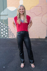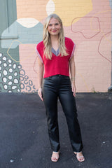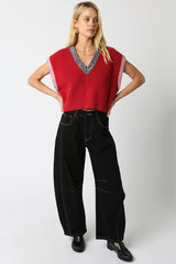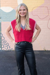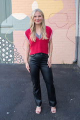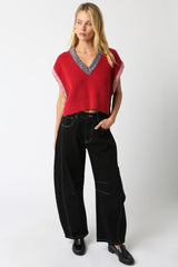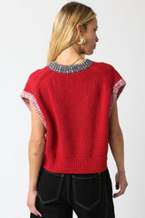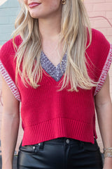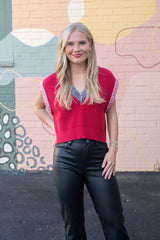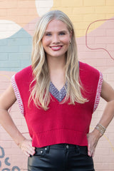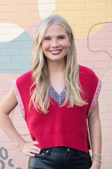 Turn heads with the Leilani Contrast Trim Vest in Scarlet Combo! This sleeveless, V-neck top features bold contrast trims that add a pop of fun to your outfit. Side slits provide extra movement and a breezy feel, making it a playful and stylish choice for sunny days and casual adventures!