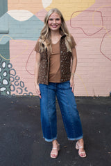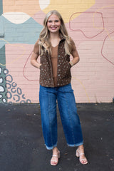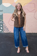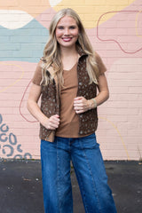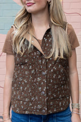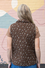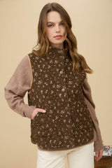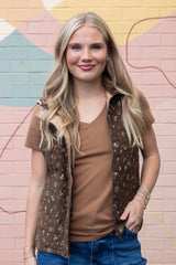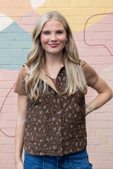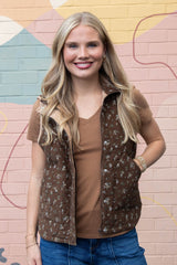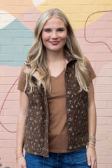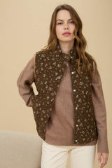 Stay cozy and stylish with the Lia Floral Quilted Puffer Vest in Brown Multi. Featuring a playful floral print on soft corduroy, this puffer-style vest has a mock neck and easy zipper plus snap button closure to keep the chill out. Side pockets are perfect for storing your essentials or warming your hands. Add a touch of charm and warmth to any outfit with this fun, versatile vest!