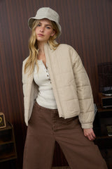 Stay warm and stylish with the Cora Puffer Jacket in Khaki. Featuring quilted squares and a cozy collar, this zip-up jacket combines classic design with modern comfort. Its relaxed fit offers easy layering, while the silky fabric ensures a smooth feel without stretch. Two front pockets add functional storage, making it perfect for everyday wear. Elevate your outerwear collection with this versatile, lightweight puffer that delivers both warmth and effortless style.