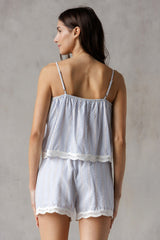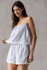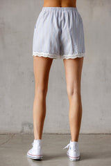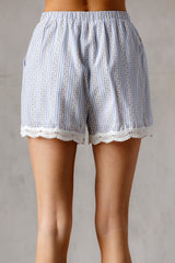 These Sofia Floral Pinstripe Lace Hem Shorts bring a fun splash of color with blue, white, and orange stripes. The delicate lace hem adds a flirty touch, while the elastic waist ensures a comfy fit all day long. Practical side pockets keep your essentials close, and the soft inner lining feels great against your skin. Perfect for sunny days when you want to look cute and stay cool!