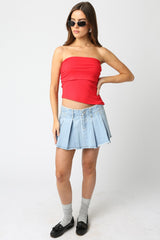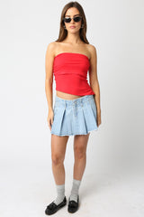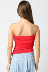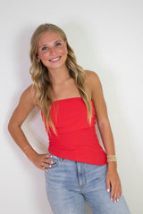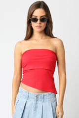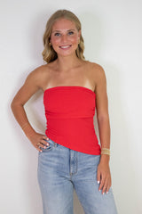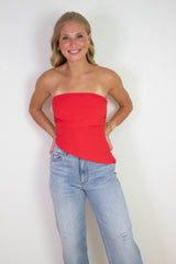 Turn heads with the Sonia Asymmetrical Hem Foldover Top in vibrant red. This strapless, ribbed knit piece features playful ruched side details and a chic foldover style that adds flair to your look. The asymmetrical hem brings a fun twist, making it perfect for nights out or casual days when you want to stand out!