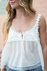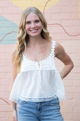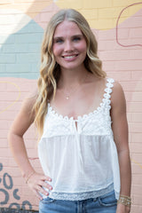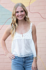 Flirty and feminine, the Stevie Lace Tank in Clean Ivory features delicate lace trim and scalloped straps that add a touch of romance to your wardrobe. The playful scoop neck with tie detail complements the flowy babydoll silhouette, creating the perfect blend of comfort and charm for sunny days or layered looks!