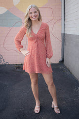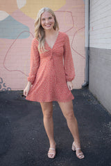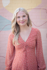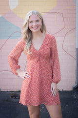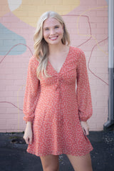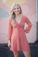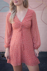 Brighten your day with the Suri Ditsy Floral Mini Dress in vibrant orange. Featuring a flirty gathered tie front and a flattering V-neck, this playful dress combines long sleeves with a breezy mini length for effortless charm. A back zipper closure ensures a perfect fit, making it your go-to piece for sunny strolls or lively gatherings!