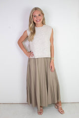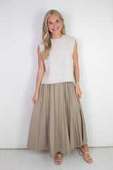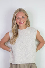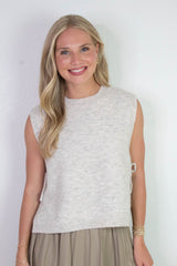 This playful Sybil Side Tie Sweater Vest in oatmeal adds a fun twist to your layering game. Featuring cozy sleeveless comfort, a classic round neck, and flirty side slits, it’s finished with charming side ties that let you adjust your look with ease. Perfect for mixing and matching on breezy days!