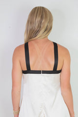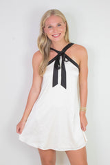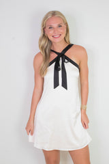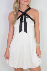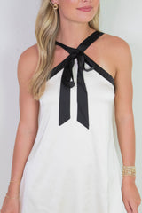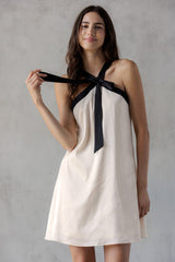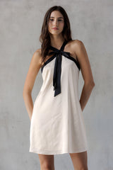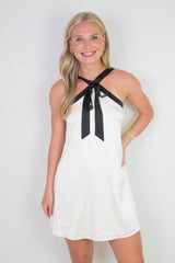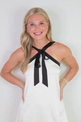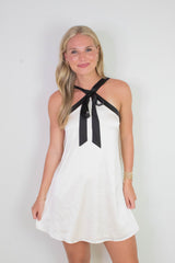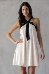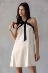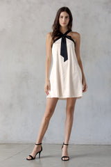 Turn heads in the Tabitha Two Tone Halter Neck Dress, featuring a playful bow detail and a chic two-toned champagne and black design. Its sleeveless cut and halter neck highlight your shoulders, while the back zipper ensures a perfect fit. Ideal for making a stylish statement at any event!