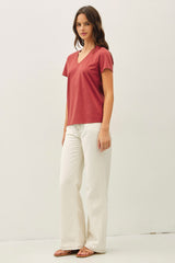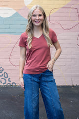 Slip into cozy comfort with the Tatum Cotton Jersey V-Neck Tee in Chili Oil. Its soft cotton jersey fabric pairs perfectly with a flattering V-neck and breezy short sleeves, making it your go-to for effortless style and all-day ease. Whether you’re lounging or out and about, this playful tee adds a sweet touch of chocolatey charm to your wardrobe!