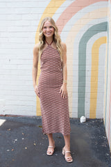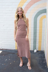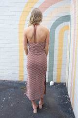 Get ready to turn heads in the Tatum Tie Halter Neck Dress from Steve Madden. This stunning maxi dress features a unique two-toned design and an open knit pattern that will keep you cool and breezy. With a playful tie halter neck and flattering side slits, you'll be the life of the party in this dress!