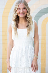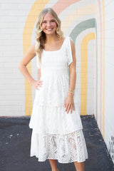 This midi dress is a breath of fresh air, with a playful tiered design and tie shoulders. The burnout woven fabric and smocked bodice add comfort and style, while the elastic waist and square neck provide a flattering fit!