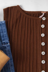 Rock a playful look with the Tilly Vest from Free People! This ribbed knit vest features a button front, boat neck, sleeveless design, and a fun lettuce hem. Perfect for adding some style to your wardrobe!