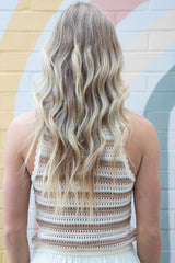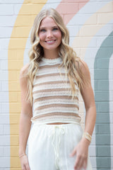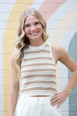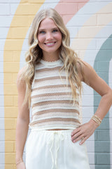 Unleash your playful side with the Tisha Striped Sweater Tank by Sadie & Sage. This cream multi top features a round neck, sleeveless design, and open knit with scalloped edges for a fun and flirty look. Slightly cropped for a trendy touch!