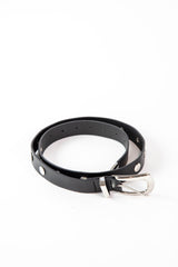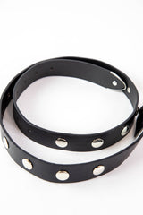 Introducing Uma Flat Metallic Rivet Belt, the perfect accessory for adding a touch of edgy style to any outfit. Made of faux leather, this belt features eye-catching metallic rivet details that make a statement. Upgrade your look with this versatile and trendy piece!