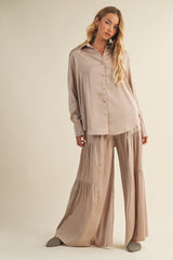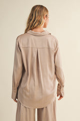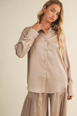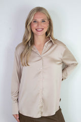 Slip into the Valentina Silky Button Down Top in Champagne for a touch of effortless chic. Its silky feel and oversized fit keep things cozy, while the classic collar and long sleeves add a polished twist. Perfect for lounging or layering, this playful top brings comfy style to any day!