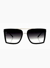 Velda Sunglasses by Otra feature an oversized plastic face with a gold metal frame and come with a gradient smoke lens and Soft Cream Vegan Case. The vegan case offers a protective covering for the sunglasses, while the gradient smoke lens offers higher clarity and protection from UV rays.