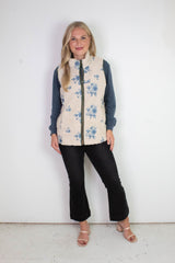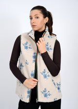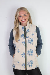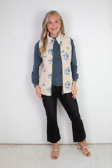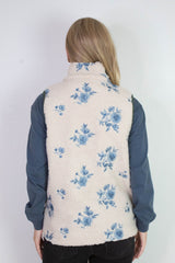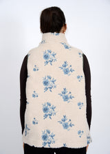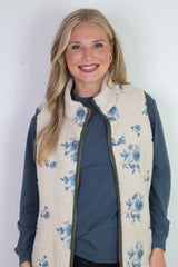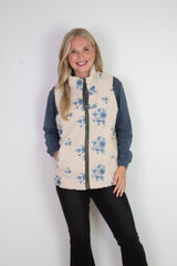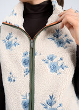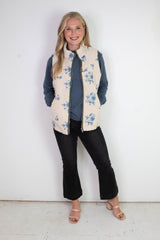 Stay cozy and stylish with the Viola Front Zip Vest in Cream Blue. Featuring a playful embroidered floral print and a chic mock neck, this sherpa-lined vest adds warmth with a soft touch. The front zipper closure and side pockets make it easy to wear and keep essentials close. Contrast trim adds a fun pop to your outfit, perfect for brightening up any chilly day!