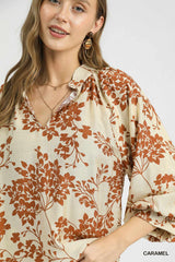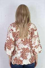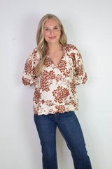 Embrace springtime charm with the Zorina Cherry Blossom Print Blouse in warm caramel. Featuring a playful scalloped hem and flirty split V-neck, this blouse adds a touch of whimsy to your wardrobe. The three-quarter sleeves offer just the right amount of coverage while keeping things breezy and fun. Perfect for brightening up any day with effortless style!