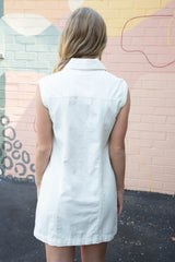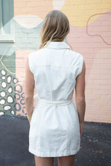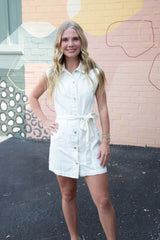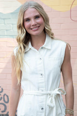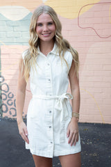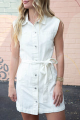 Slip into summer-ready style with this bleached white denim dress! This playful Ila dress features a sleeveless design perfect for sunny days, convenient chest and side pockets for your essentials, and a classic collared button-down front. The waist tie cinches your silhouette for that just-right fit. From brunch to beach walks, this versatile piece keeps you looking effortlessly cool!