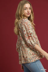 This playful brown top features charming half sleeves and a smocked tie neck that adds a flirty touch. The paisley print brings a fun, vintage vibe to your wardrobe, making it perfect for casual outings or lively gatherings. Comfortable and stylish, it’s a delightful way to brighten your day!