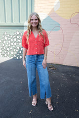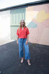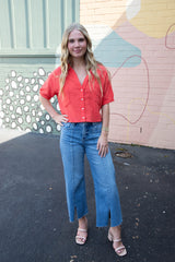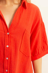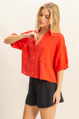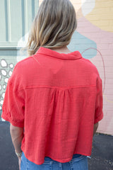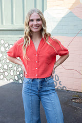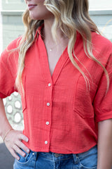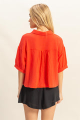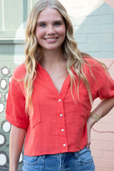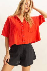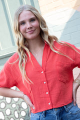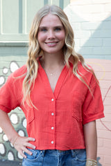 Unleash your summer style with our Janelle Cotton Gauze Crop Shirt in vibrant Red Orange! This playful cropped V-neck features convenient chest pockets and short sleeves for that perfect balance of cute and casual. The collared design adds just enough polish to take you from beach to brunch without missing a beat!