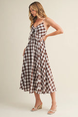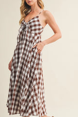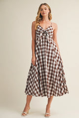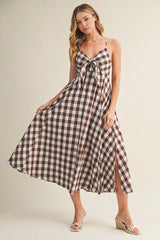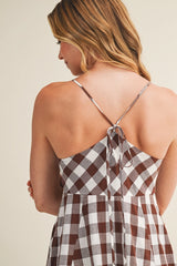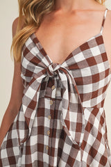 Chocolate brown gingham meets effortless charm in the Everly Dress. The playful tie-front detail adds a flirty touch that cinches at just the right spot, while the classic checked pattern keeps things timeless. Perfect for brunch dates, casual outings, or whenever you want to look put-together without trying too hard. A wardrobe essential that works as hard as you do.