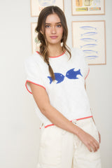 Dive into style with this charming Fish Jacquard sweater, featuring an adorable fish pattern in a soft cream base. The playful jacquard design is elevated with contrasting trim details that add visual interest and dimension. Perfect for casual outings or cozy days at home, this short-sleeve sweater brings a whimsical touch to your wardrobe. Whether you're a seafood lover or just appreciate quirky knitwear, this piece is sure to make a splash with its unique personality and comfortable fit.