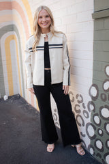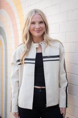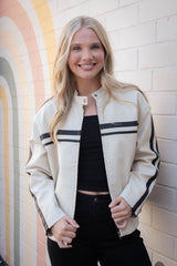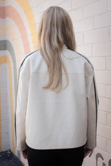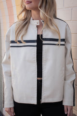 Step out in style with the Noa Line Detail Faux Leather Jacket in ecru. Featuring long sleeves and bold contrast stripes, this jacket adds a fun edge to any outfit. The button-detailed neck and zipper closure offer a playful twist on classic design, while handy side pockets keep your essentials close. Perfect for those who love a mix of chic and cheeky in their wardrobe!